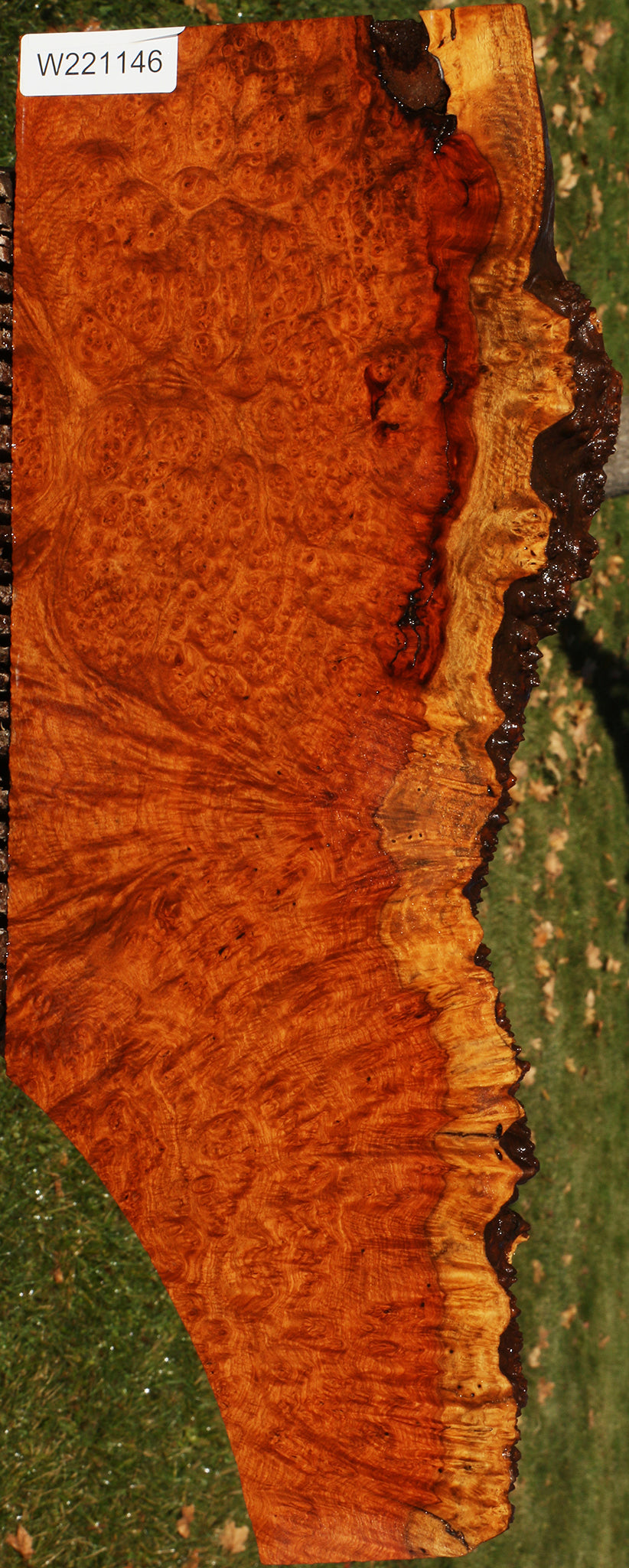 This exceptional stock combines figure and burl with warm Amboyna-like colors! There are inclusions present on all pieces. Some may have rough edges and small voids. Crushed turquoise or other minerals can be used as a stunning inlay contrast in areas that contain inclusions. This stock has been air dried for 7 years and is ready to use. This piece has checks and inclusions. Please see pictures for details.