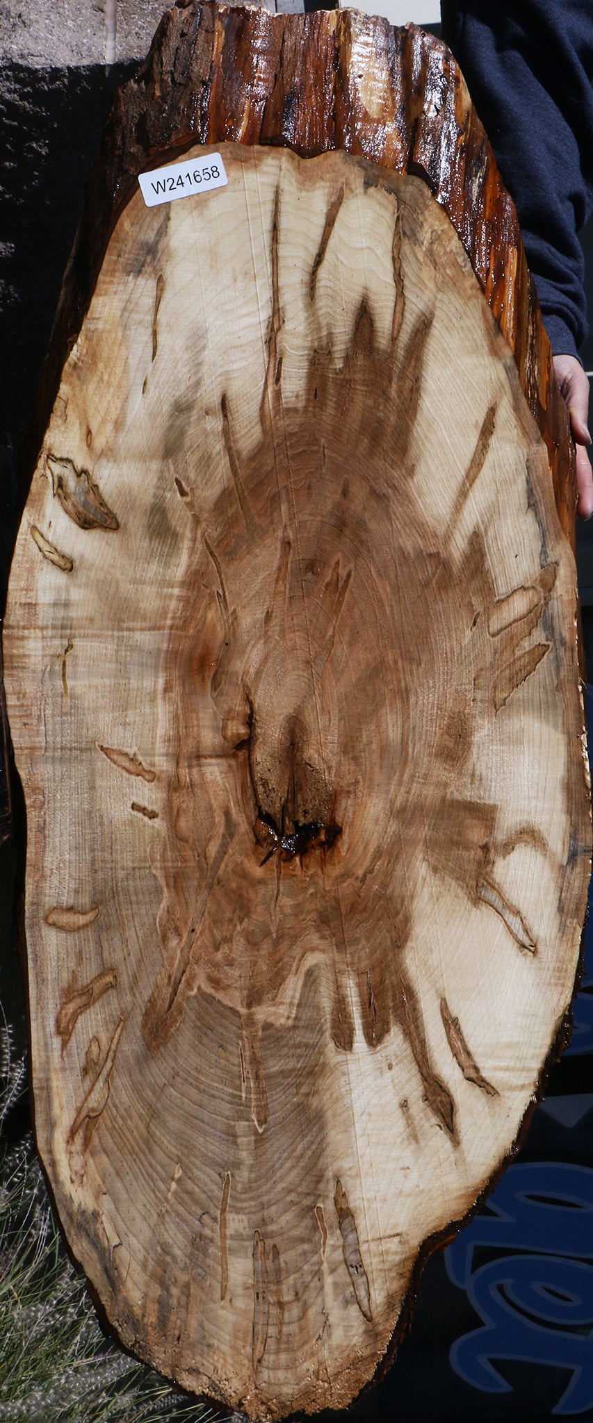This colorful Ambrosia Maple cookie has stunning color streaks and the possibility of fiddleback. It is a unique hardwood that is kiln dried and ready to use. The colorful ambrosia streaks are caused by the Ambrosia beetle. Some small Ambrosia beetle holes may be present. Live edges are present and may contain an occasional machine mark or check. Cookies over 20″ long may have a slight 1/16″ to 1/8″ bow, cup, or twist. Closed grain makes this Maple species easy to finish! This is ideal for a charcuterie board, end table, or anything else your creative mind can think of! This piece has inclusions. Please see pictures for details.