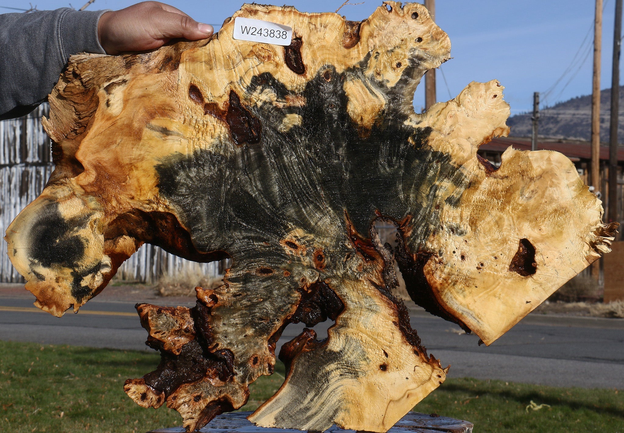 This beautiful Buckeye Burl has wonderful golden & blue colors with a blend of burl eyes that will yield distinctive woodworking projects. This lumber is air dried and ready to use. Bark inclusions, checks, and voids are normal with this species. Buckeye works easily and yields amazingly artistic articles! This piece has splits. Please see pictures for details.