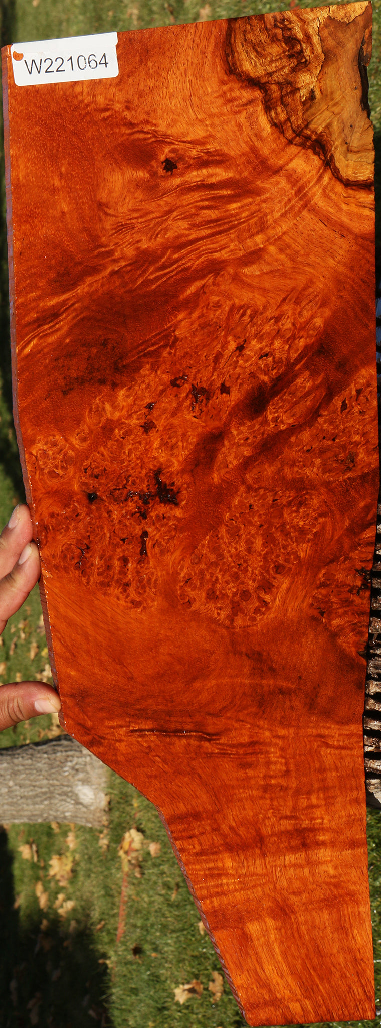 This exceptional stock combines figure and burl with warm Amboyna-like colors! There are inclusions present on all pieces. Some may have rough edges and small voids. Crushed turquoise or other minerals can be used as a stunning inlay contrast in areas that contain inclusions. This stock has been air dried for 7 years and is ready to use. This piece is suitable for an electric guitar. It has checks and inclusions. Please see pictures for details.